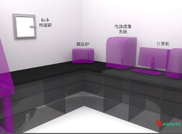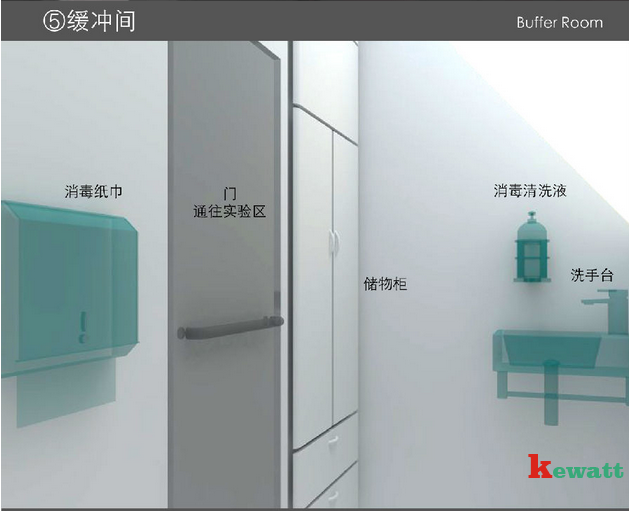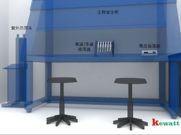 在三個實驗區和三個緩沖區頂部以及傳送窗內部安裝有紫外燈,供消毒用。在試劑準備區和標本制備區還設置移動紫外線燈,對實驗桌進行局部消毒。