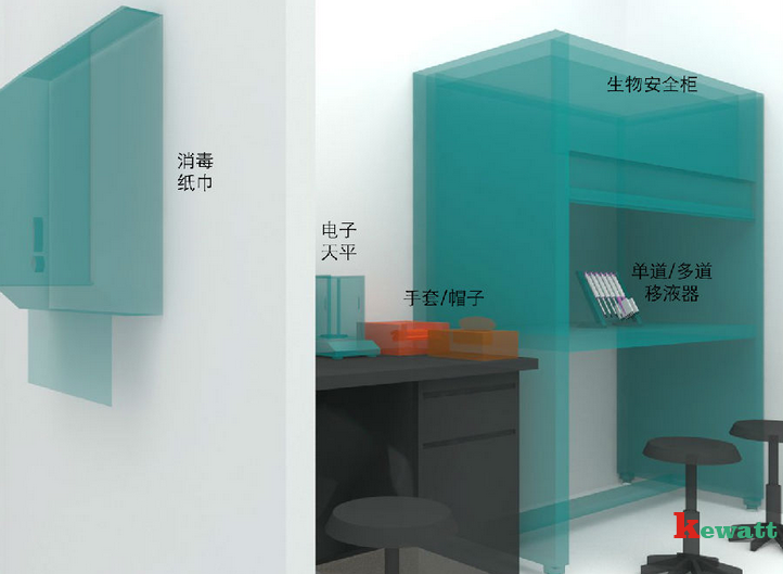 該實驗區主要進行的操作為貯存試劑的制備、試劑的分裝和主反應混合液的制備。試劑和用于樣品制作的材料應直接運送至該區,不得經過其他區域。試劑原材料必須貯存在本區內,并在本區內制備成所需的貯存試劑。對與氣流壓力的控制,本區應對外界保持微正壓。