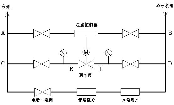 如上圖所示,作用在調節閥上的壓差值就是E和F之間的壓差值,由于C-D旁通管路與經過末端用戶的D-U-C管路的阻力相當,所以E-F之間的壓差值應等于D-U-C管路壓差(指末端用戶最不利環路壓差)減去C-E管段和F-D管段的壓差值。