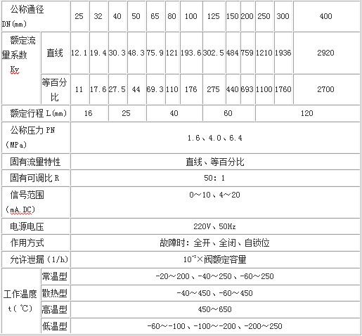 下表為上海恒星泵閥制造有限公司的ZDLN型電子式電動直通雙座調節閥的技術參數表,由公式(2)算得C=100.6,該調節閥的固有流量特性為直線型和等百分比特性,按照等百分比特性選擇最接近的C值,得到管徑為DN80,C值為110,符合選型要求。